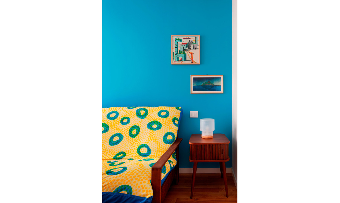 Da copiare il contrasto tra l'azzurro accesso della parete e il giallo del tessuto: qui niente è lasciato al caso, perché i due colori si alternano sui tessuti e nelle stampe appese a muro.