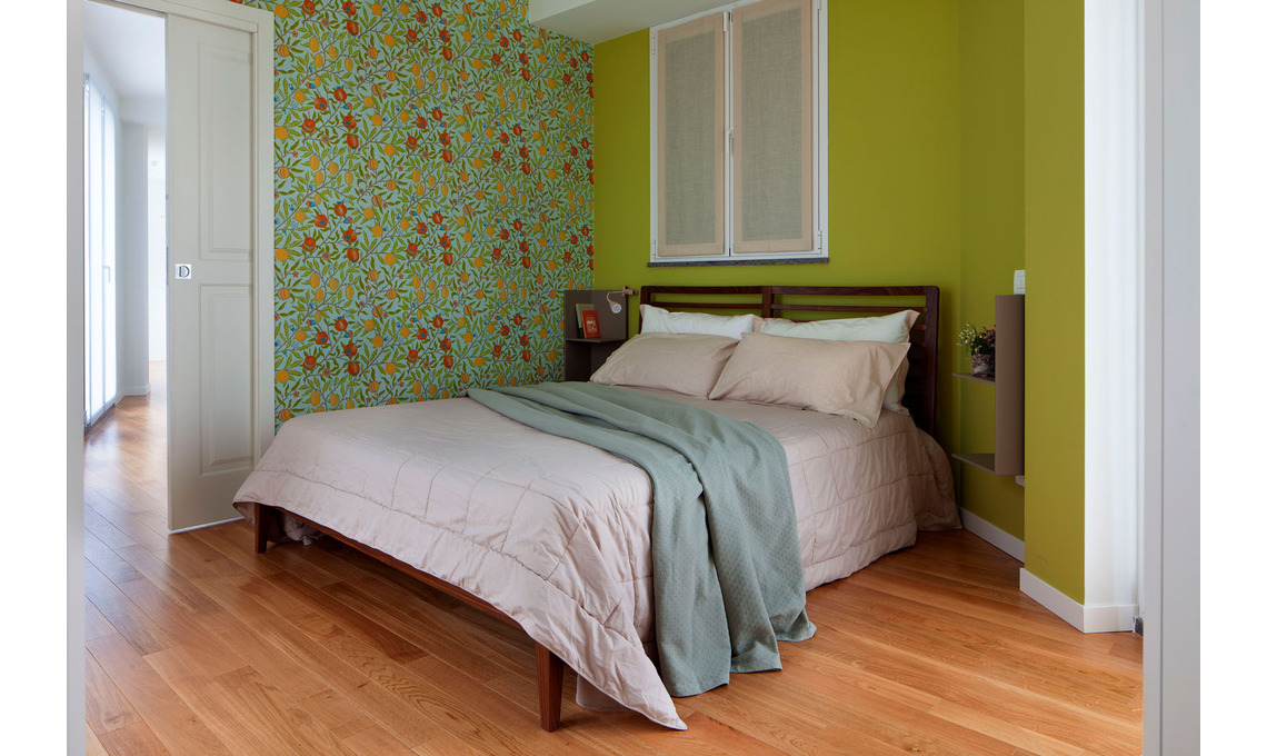 Nella camera matrimoniale Paola ha scelto un letto in legno essenziale e una carta da parati di William Morris, 'Four Fruits' del 1862, che ispira anche il colore della parete verde dietro al letto.