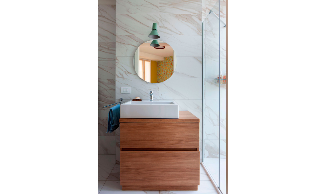 Nel bagno master, la doccia con finestra è progettata per accogliere la luce naturale. Paola ha scelto un mobile lavabo di legno chiaro e piastrelle in tonalità calde, che danno un'atmosfera intima alla zona dedicata al benessere.