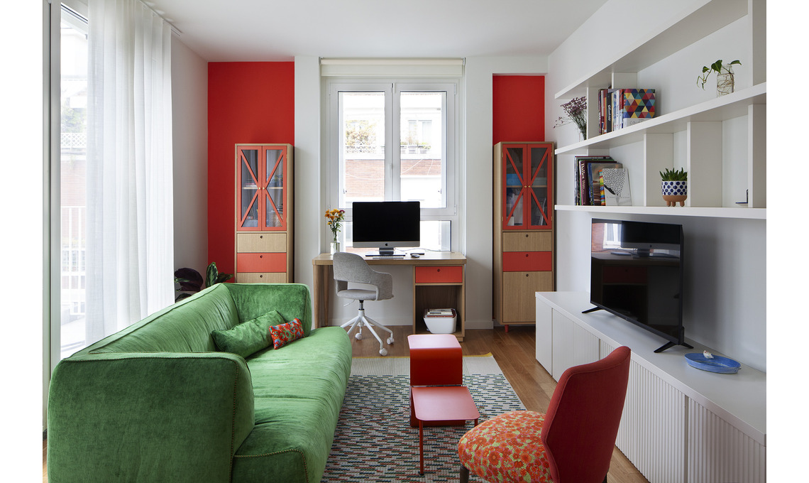 Per le mensole e il mobile tv è stato utilizzato lo stesso colore della libreria, in modo da dare maggior risalto al divano, alla poltrona (un pezzo unico anni '50 restaurato e rivestito con una stampa vintage di Ciasmo) e al tavolino in metallo arancione (True Design | WAVE). Le credenze, invece, fanno parte di un color block arancione pensato per creare un'atmosfera creativa nella zona della scrivania, dove Paola trascorre molte ore a lavorare alle sue creazioni.