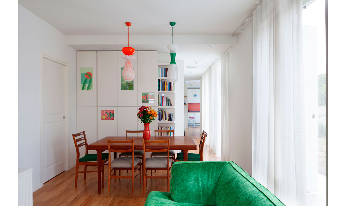 Il progetto d'arredo è stato curato dallo Studio di ArchitetturaElena Russo Interiors rispettando i desideri di Paola: vivere in un ambiente creativo, con un tocco vintage e colorato, e integrare alcuni oggetti di famiglia come le sedie Leggere del 1955 nel soggiorno e le sedie Swing disegnate da Herbert Owl per Rosenthal Lübke in metallo sul terrazzo. Le Leggere erano a casa della nonna materna, le Swing sono una memoria della casa di zia paterna.