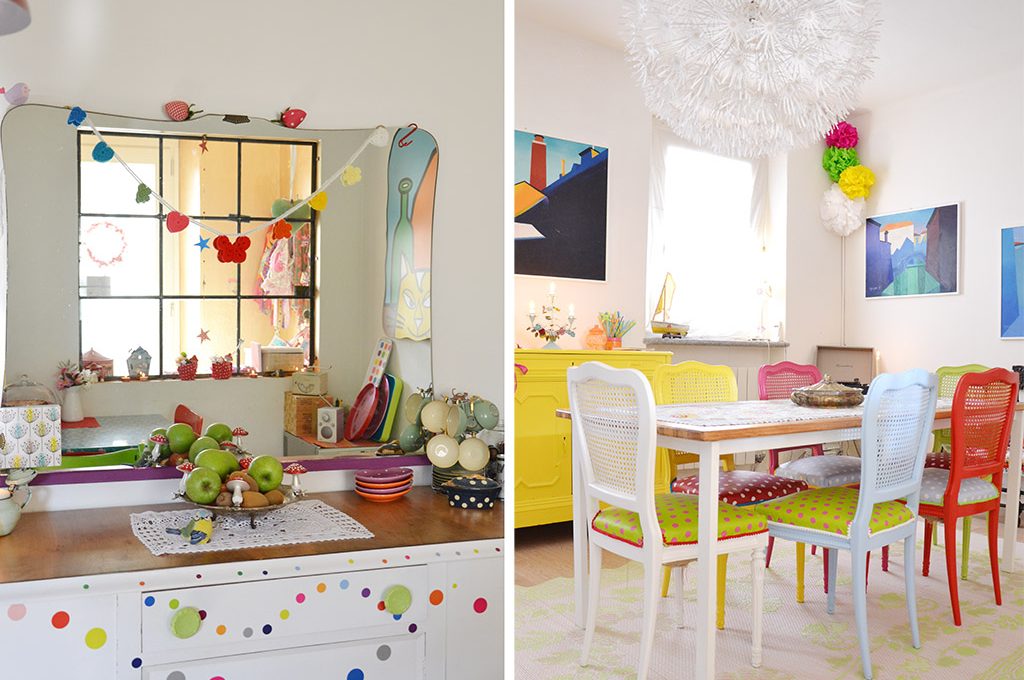 Mobili e pensili sono un'eredità della mamma. Lei li aveva verniciati di verde scuro e a me non è parso vero di 'sbiancarli' per poterli poi decorare con tante gocce di colore... Proprio come un quadro da inventare!