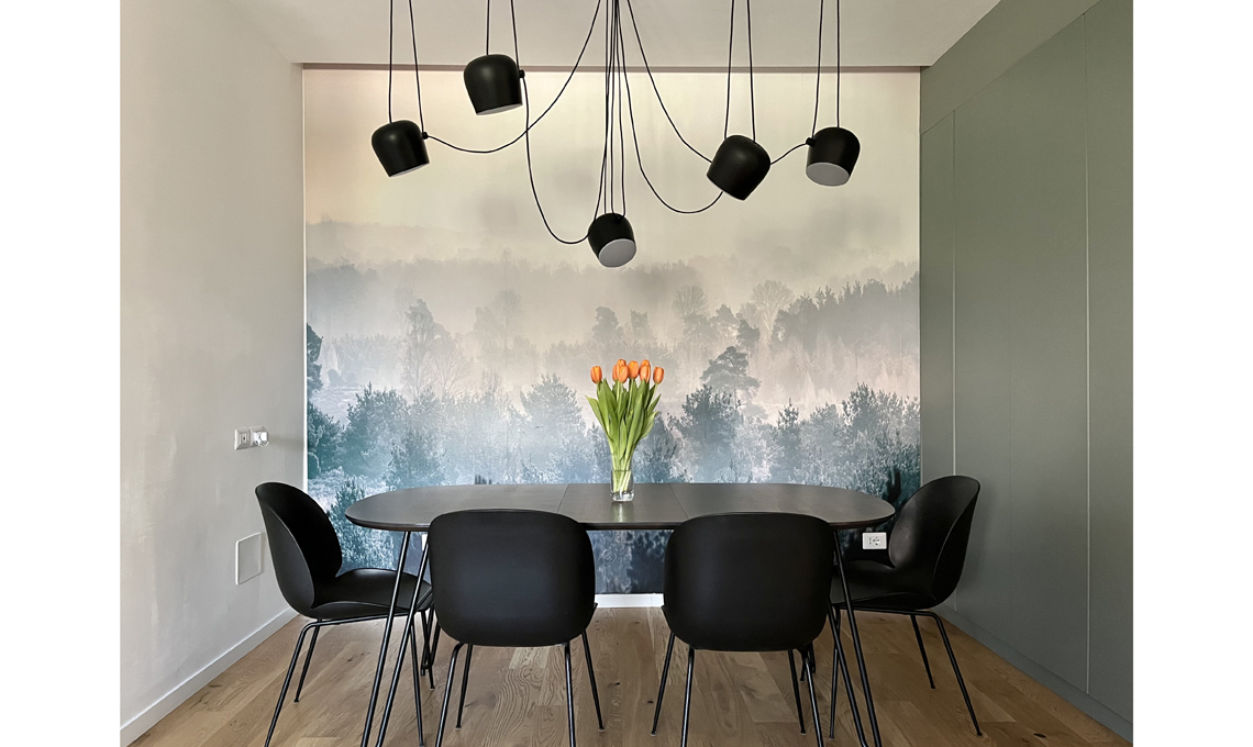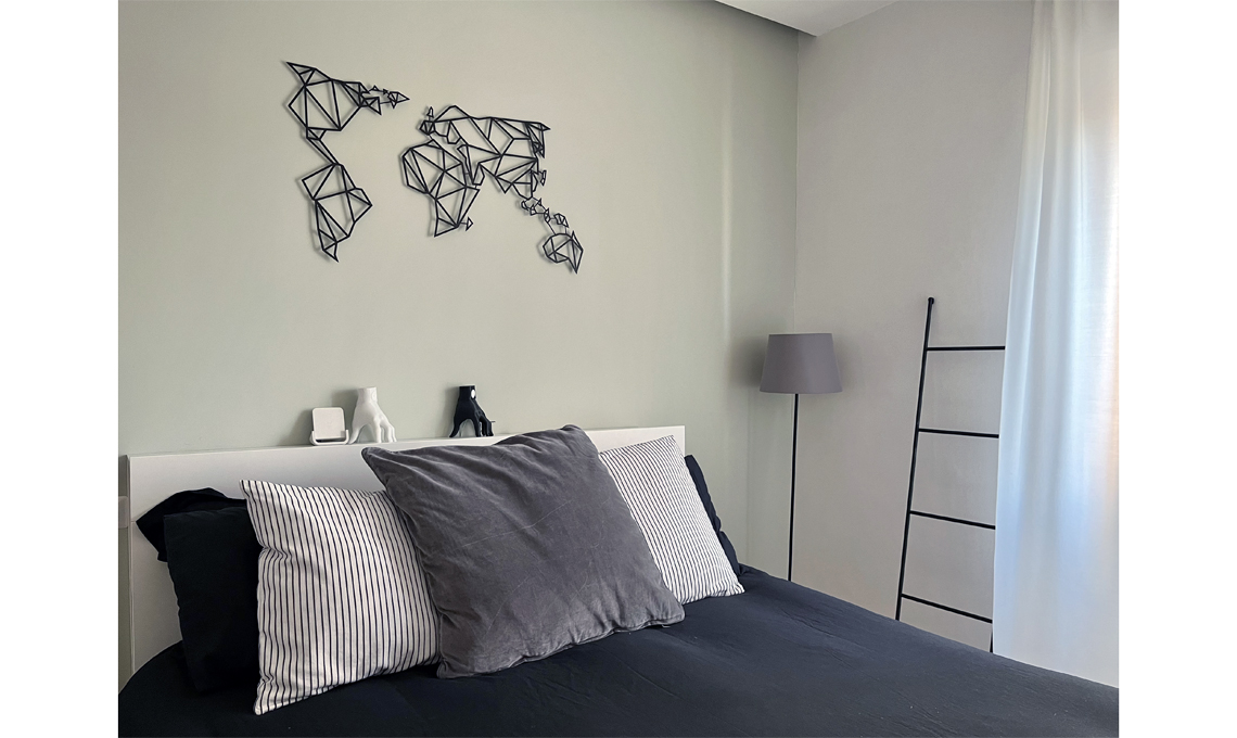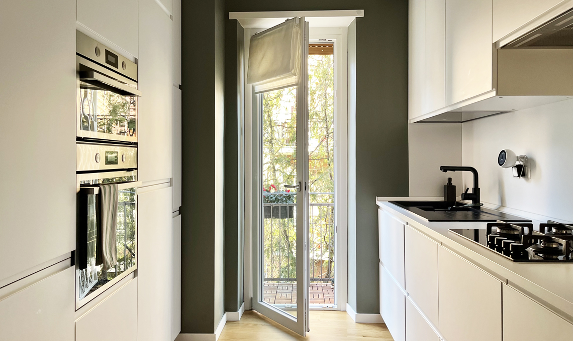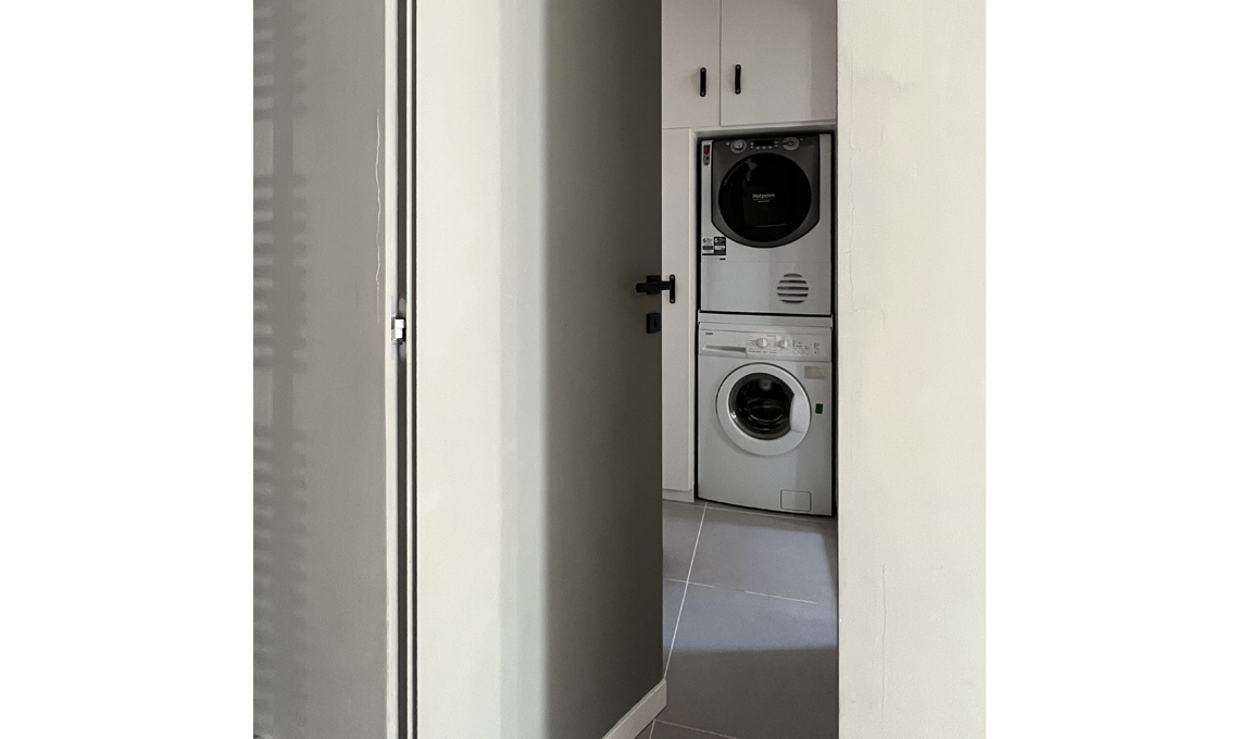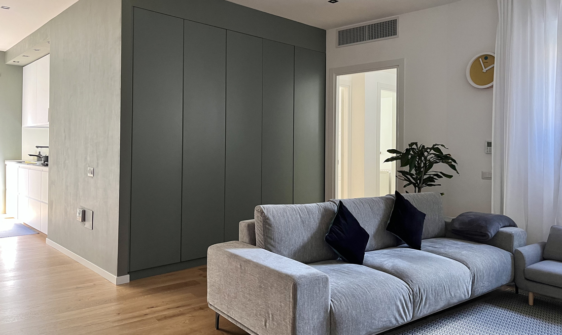 L'appartamento si presenta con un soggiorno aperto nel quale hanno voluto creare l'effetto di un blocco servizi che si inserisse all'interno dell'appartamento. Tale effetto è stato riprodotto attraverso delle grandi armadiature a muro nella zona soggiorno che nascondono la cucina e la zona lavanderia/bagno. Per caratterizzare il blocco e dare ulteriore importanza hanno usato un colore grigio-verde molto deciso, per le ante degli armadi e le pareti, che stacca nettamente rispetto al contesto. All'interno del blocco servizi, un ulteriore grande armadio contenitore su misura ingloba la lavanderia.
