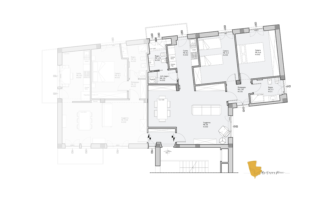 L'ingresso, vista l'impossibilità di creare una nuova apertura nel vano scale, è stato creato all'interno di un un disimpegno comune interno, una sorta di ulteriore pianerottolo da dividere con i nonni.