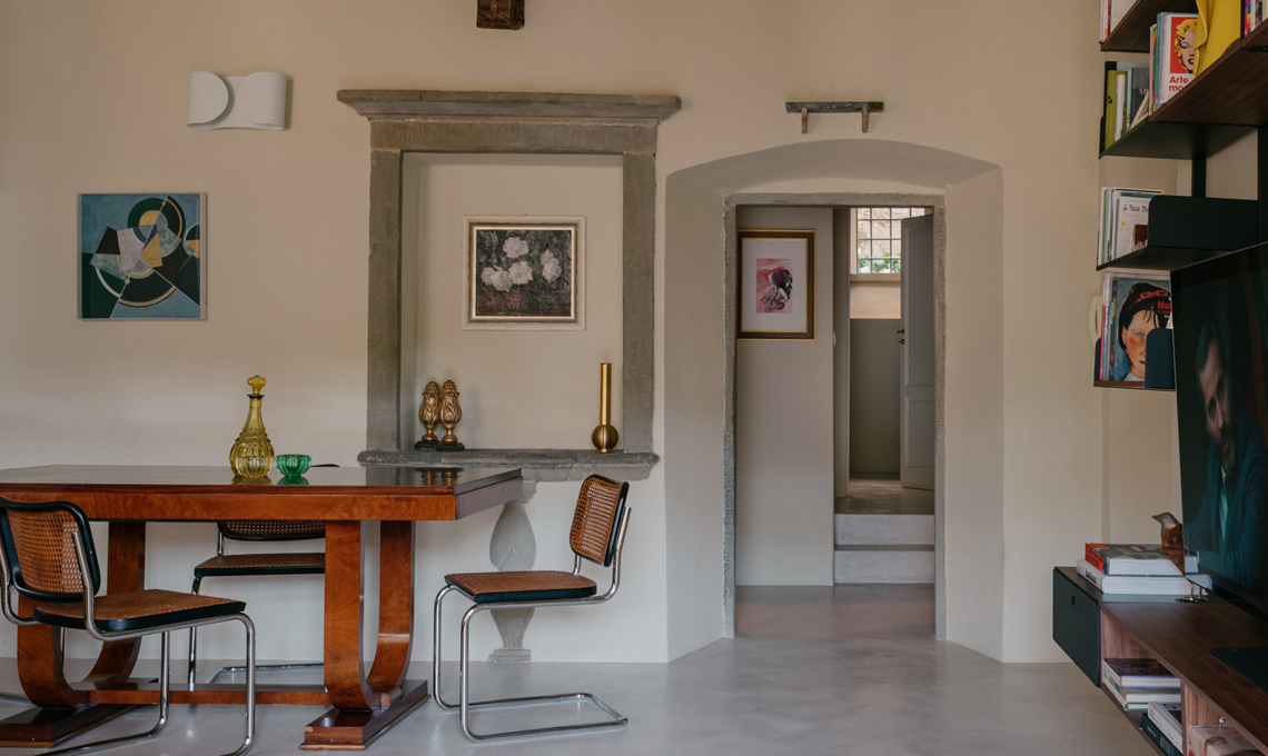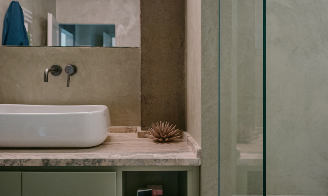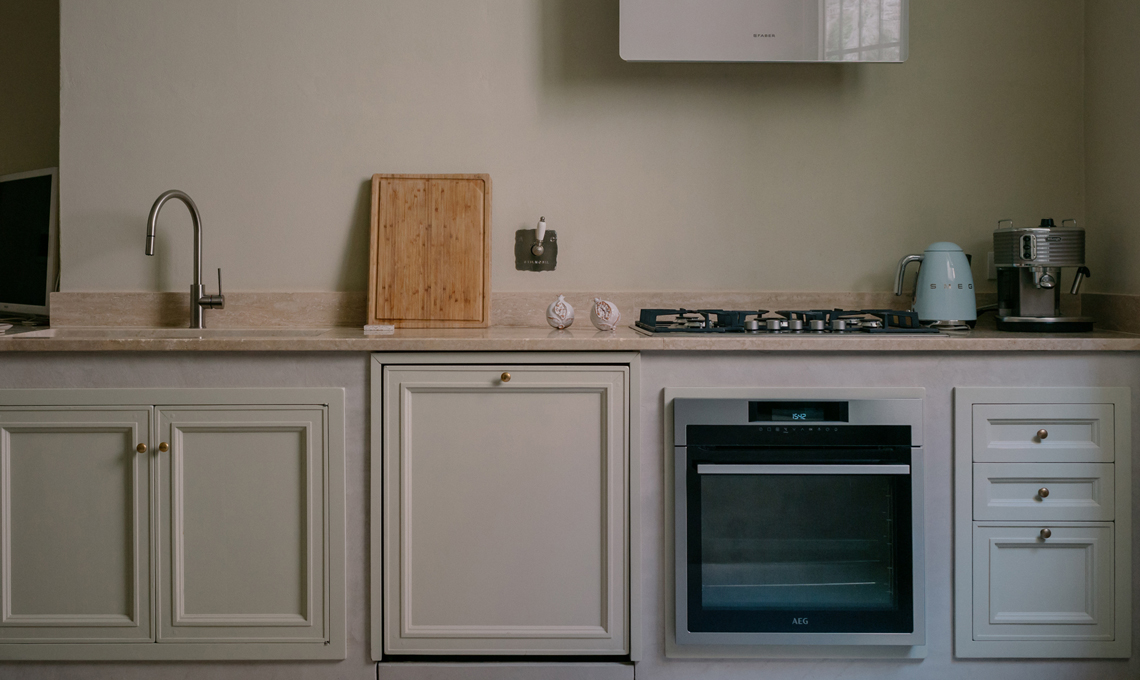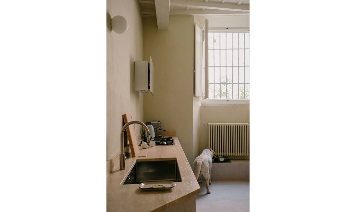 La cucina è frutto del recupero di una preesistente cucina in muratura che è stata rivestita in microcemento, in continuità con il pavimento; gli sportelli hanno cornici che richiamano una stile tradizionale, mentre il piano è in travertino color foglia. Gli elettrodomestici e gli accessori sono di ultima generazione: la cappa flat di Faber, il frigorifero vintage Smeg color acciaio, i fornelli e il forno AEG, il lavello monovasca e il miscelatore Foster. L'illuminazione della cucina è affidata alle applique Dioscuri di Artemide.