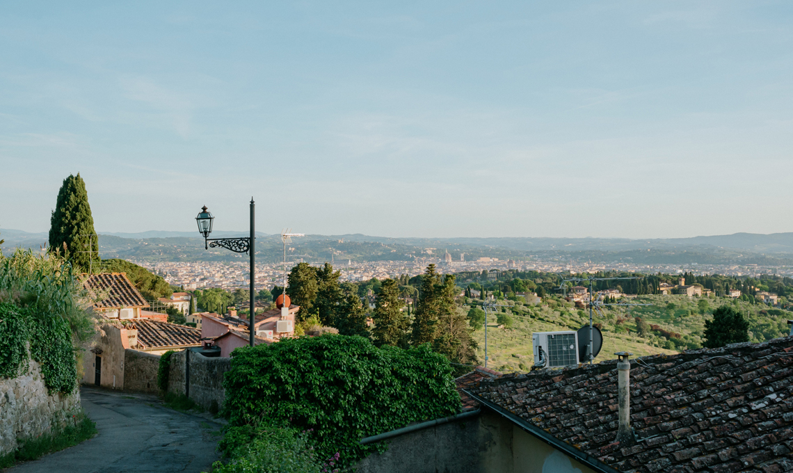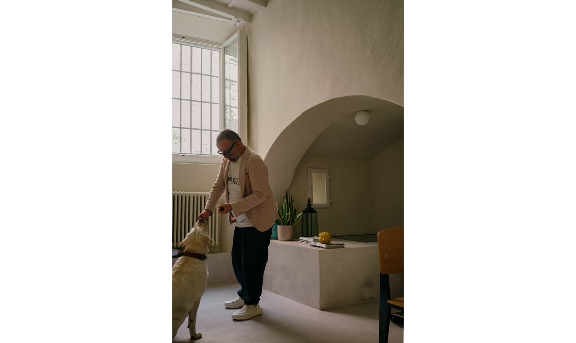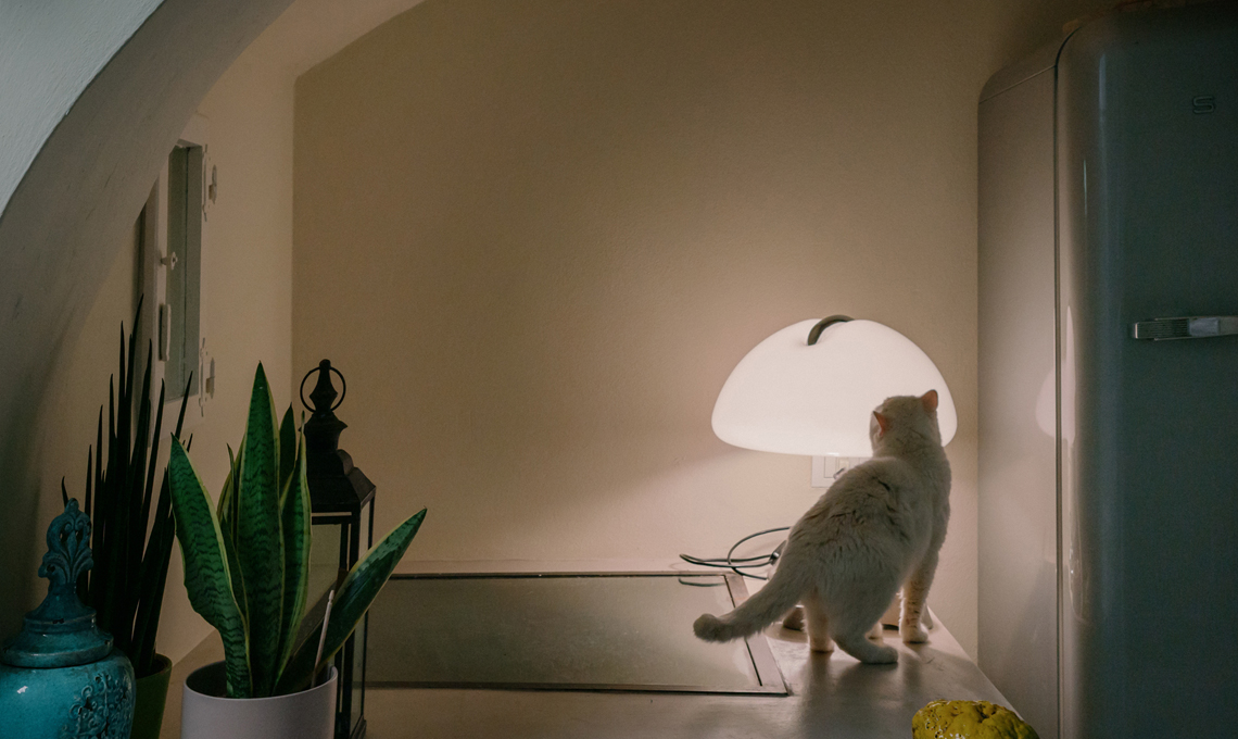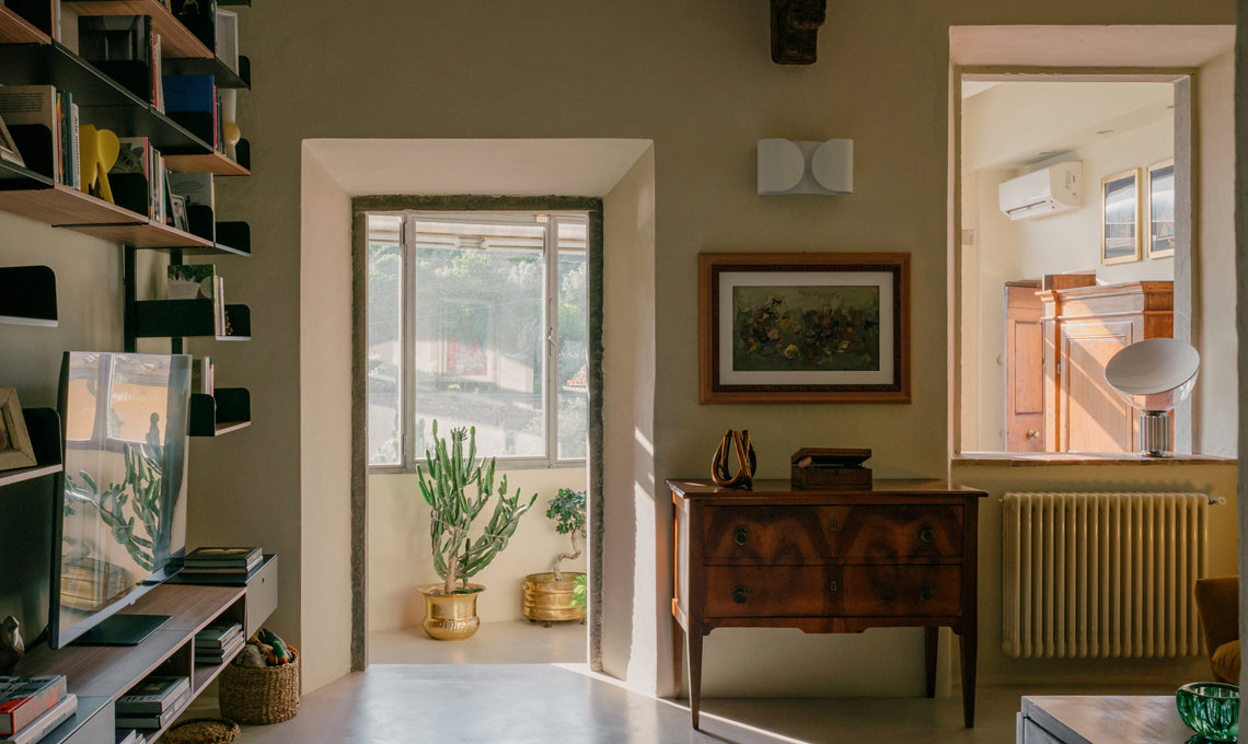 La cucina è frutto del recupero di una preesistente cucina in muratura che è stata rivestita in microcemento, in continuità con il pavimento; gli sportelli hanno cornici che richiamano una stile tradizionale, mentre il piano è in travertino color foglia. Gli elettrodomestici e gli accessori sono di ultima generazione: la cappa flat di Faber, il frigorifero vintage Smeg color acciaio, i fornelli e il forno AEG, il lavello monovasca e il miscelatore Foster. L'illuminazione della cucina è affidata alle applique Dioscuri di Artemide.
