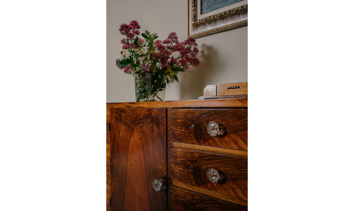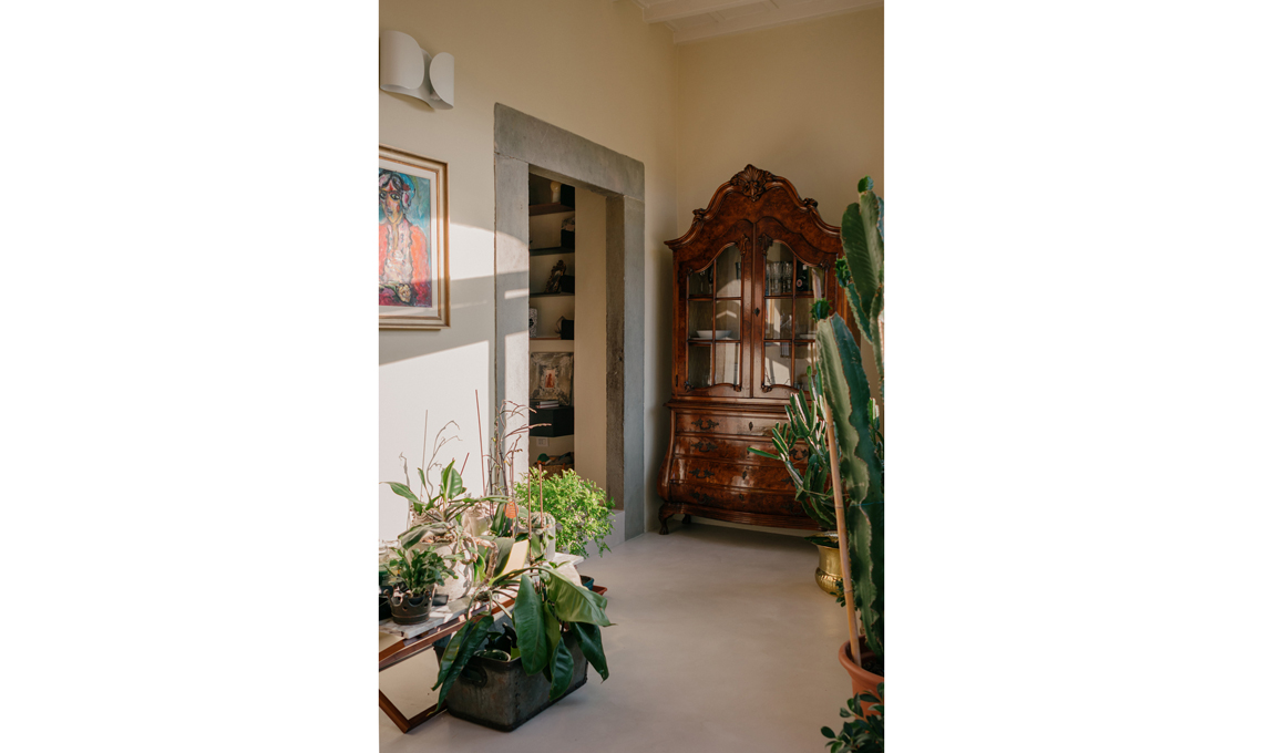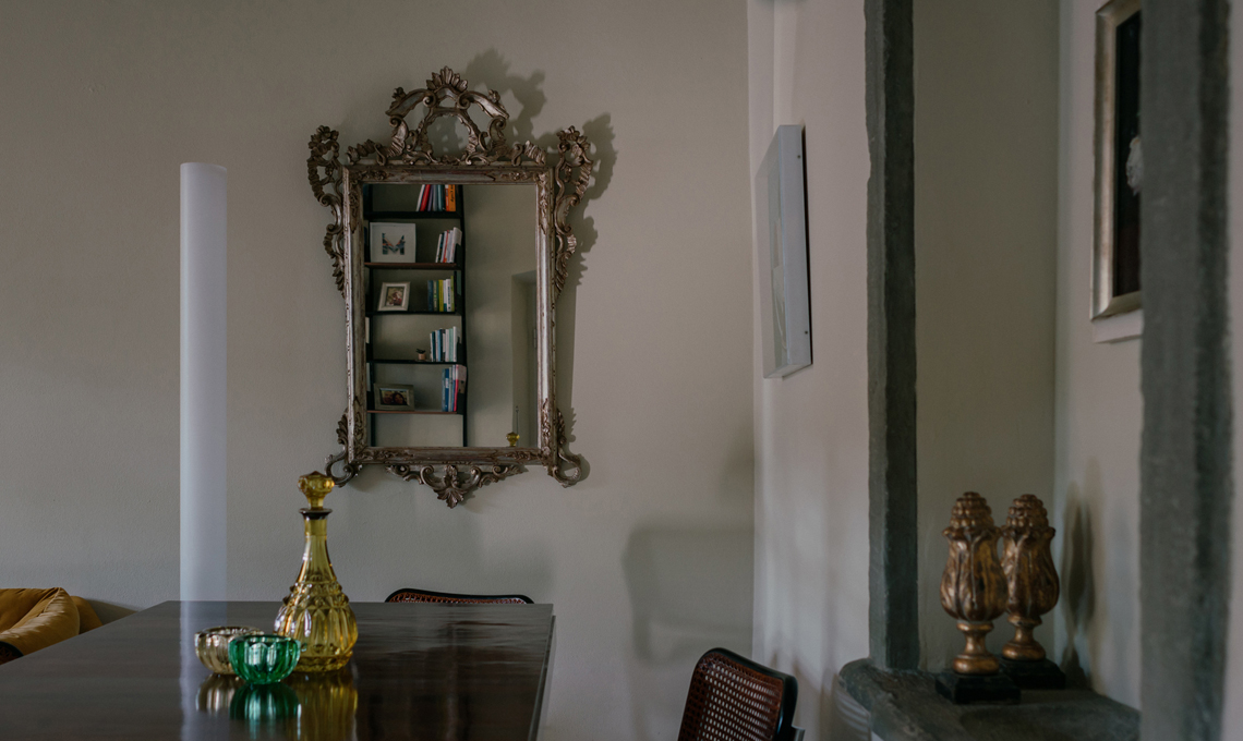 Completano l'arredo una specchiera a foglia argento fiorentina originale del Settecento, la console in ciliegio dell'Ottocento e i quadri dell'artista Sergio Scatizzi.