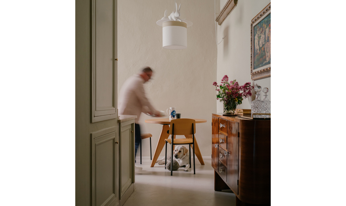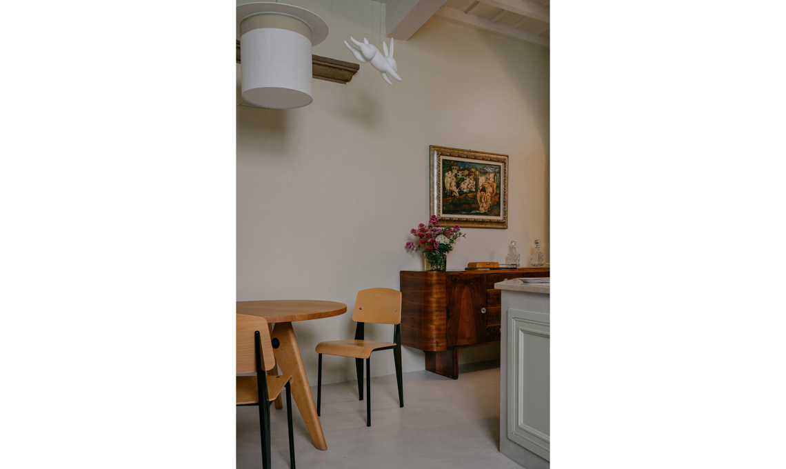 La zona pranzo, attigua alla cucina, è arredata con pezzi iconici: tavolo Gueridon e sedie Standand, disegnate da Jean Prouvé per Vitra, abbinate al lampadario Wow di Matteo Ugolini per Karman.
