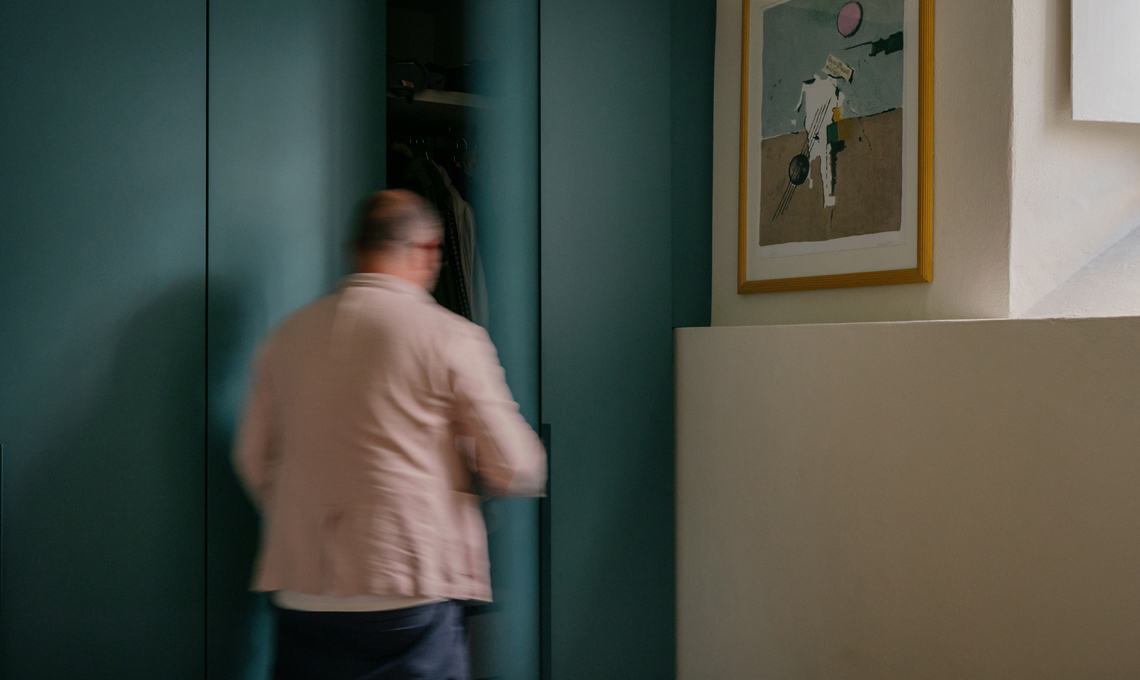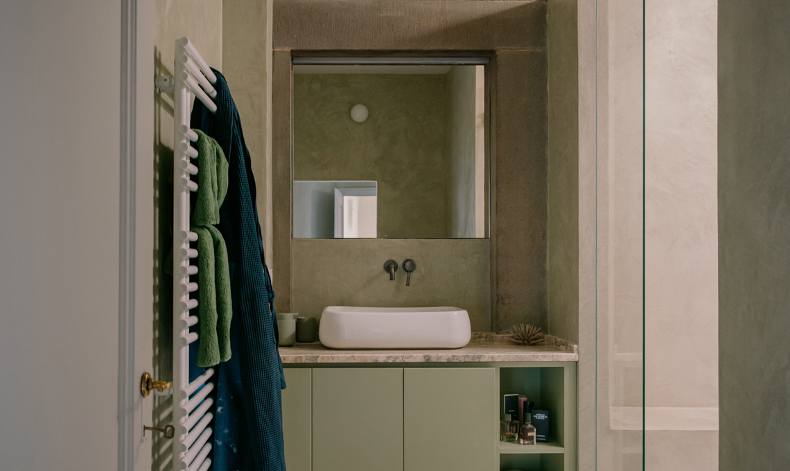 Nella camera da letto il grande armadio a muro 7 ante di Sangiacomo, appliques Tao di Artemide, comodini in metallo Hay. In bagno le pareti sono in microcemento idrorepellente color oliva, con sanitari Cielo e rubinetteria serie Kos bronzo per Zucchetti.