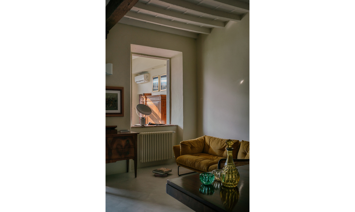 Il divano è New York Suite di Saba L'illuminazione qui è affidata alle applique Foglio di Flos, disegnate da Tobia Scarpa, alla piantana Pistillo di Martinelli luce, e a una lampada Taccia di Flos, disegnata da Castiglioni.