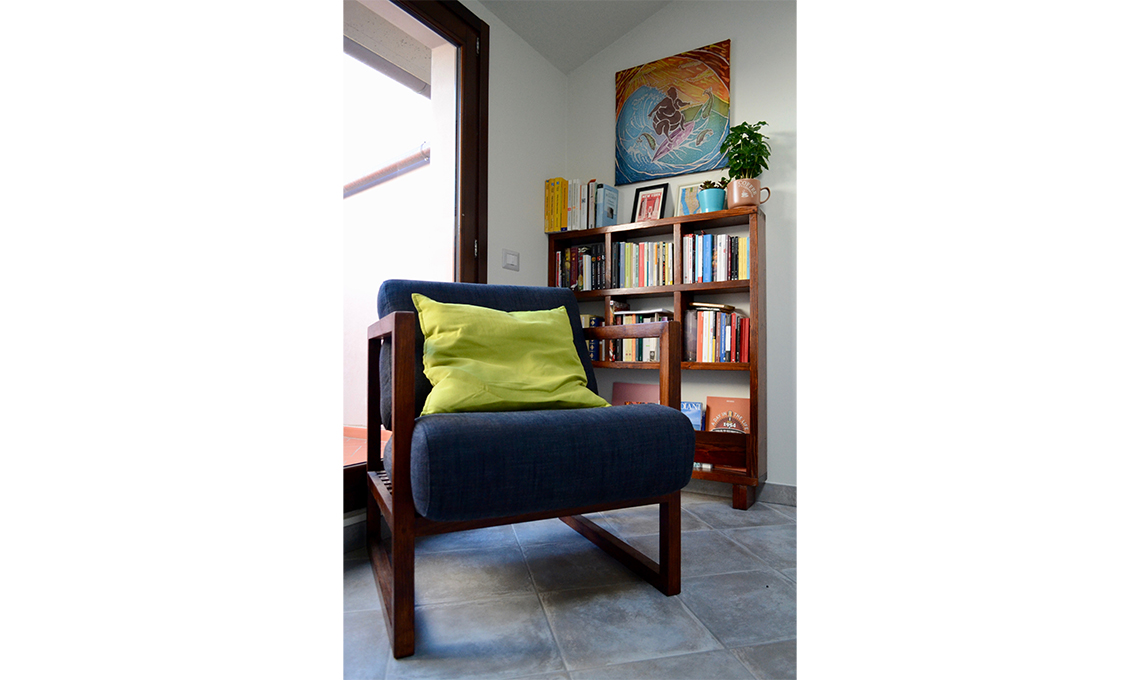- la poltrona e la libreria nell'angolo lettura, entrambe in legno massello di castagno, macchiate con finitura di ciliegio