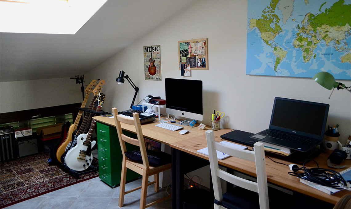 Il nostro studio è una stanza della musica. Io e Filippo ci siamo conosciuti grazie alla comune passione per la musica; suoniamo insieme in una band da circa 10 anni, e nella nostra casa non poteva mancare una stanza dedicata a questa grande passione. In giro per casa ci sono sempre le sue chitarre, i miei bassi e gli ukulele, che suoniamo entrambi».