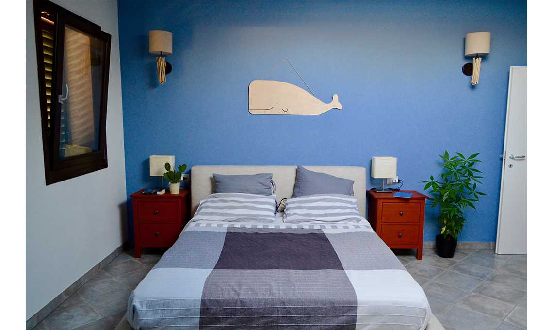 - In camera da letto, la balena appesa al muro è un regalo di nozze di una coppia di amici, anch'essa artigianale.