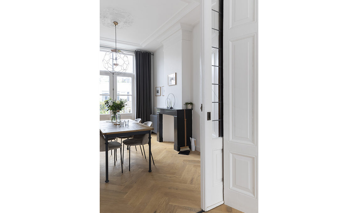 'Il punto di partenza è stato il soggiorno. Qui il parquet ancora non c’era, solo un pavimento scricchiolante e non isolato. Ho scelto una spina di pesce, che ben si sposa con gli altri dettagli della stanza. I due grandi caminetti neri di marmo, in soggiorno e sala da pranzo, sono sicuramente il punto focale delle stanze.'
