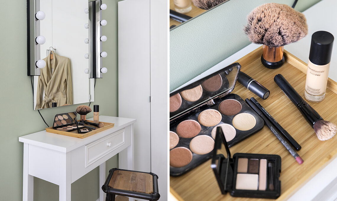 La cabina armadio è semi aperta sulla stanza. Dietro la parete si nasconde anche un'attrezzata zona trucco! La macchina da cucire Singer è stata acquistata in un mercatino in Germania.