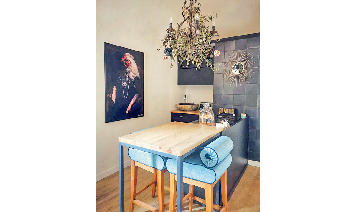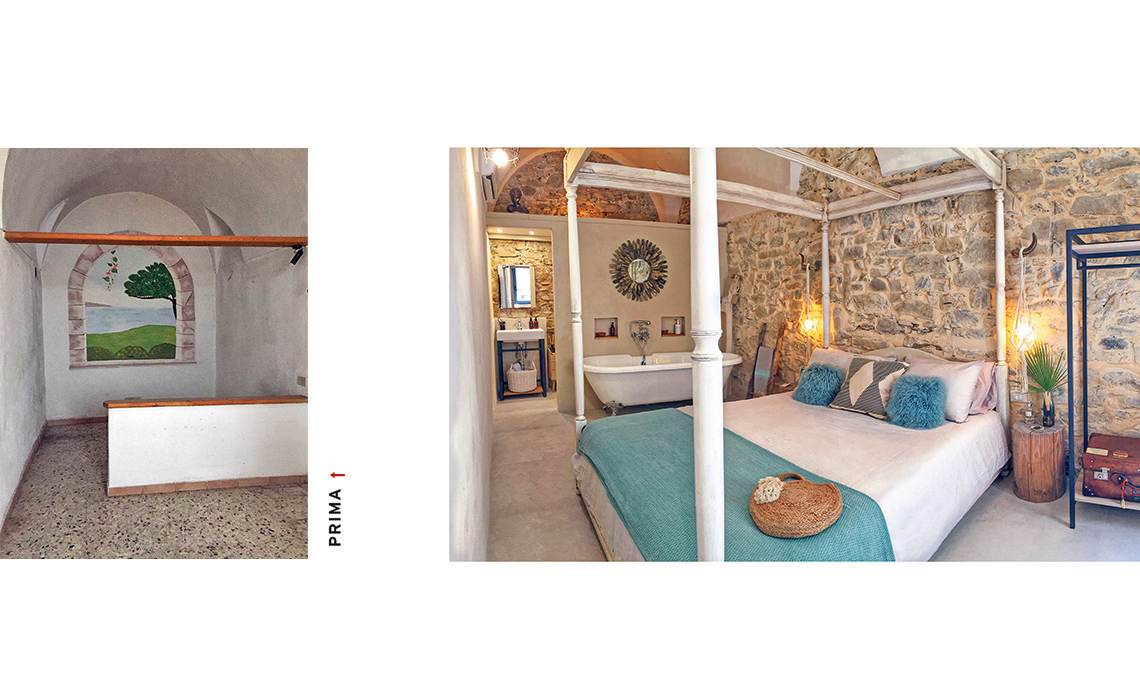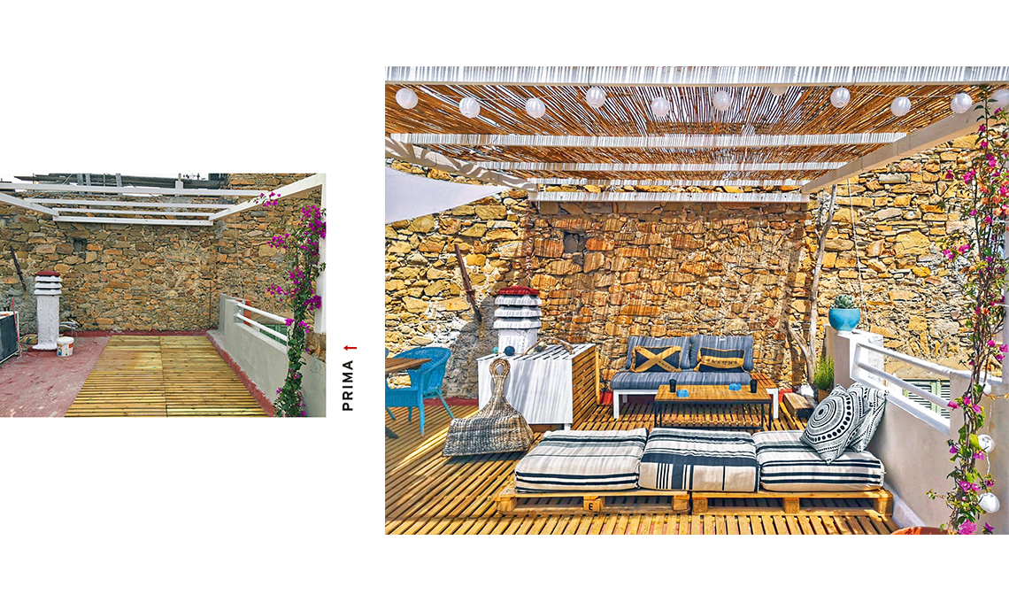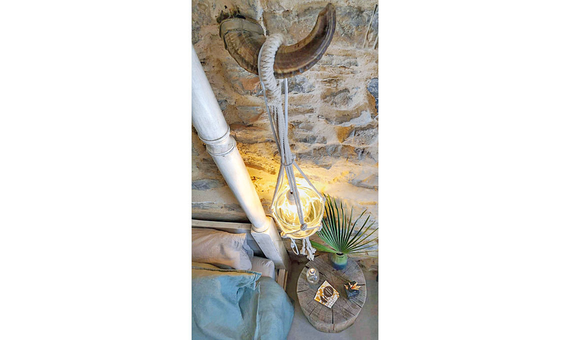 I vecchi intonaci nascondevano la pietra originaria: con pazienza Olenka e Andrea li hanno scrostati tutti a mano. Anche in camera sono stati recuperati gli originari muri in pietra. Per aggiungere sontuosità senza strafare, i proprietari hanno cercato sugli annunci dell’usato un letto a baldacchino: è costato 80 euro e fa la sua figura!. Le lampade ai lati del letto sono appese a due corna comprate alcuni anni fa in Marocco: erano finite subito in cantina, ma sono state recuperate, diventando utilissime! Olenka ha inserito bulbi vintage in due portalampade fai-da-te e li ha appesi alle corna usando due portavasi in macramè. L’effetto è davvero particolare e il budget ultra-contenuto. Maison Buonaparte ha anche un grande terrazzo a disposizione degli ospiti. In mezzo spuntava un comignolo bianco che non si poteva eliminare. Con i pezzi avanzati dalla copertura a pavimento (realizzata con quadrotti di Leroy Merlin avvitati fra loro), l’hanno rivestito e trasformato da nota di disturbo in comodo appoggio. La copertura in legno a pavimento ha permesso di cambiare radicalmente l’aspetto e l’atmosfera del grande terrazzo (che era piuttosto anonimo e spoglio) in modo rapido e senza dover spendere una fortuna. È bastato ombreggiare poi con una copertura in canne, una tenda e aggiungere una catena di luci per la sera. La chaise longue è tutta fai-da-te: Olenka e Andrea hanno dipinto due pallet e rivestito con tessuto a righe tre maxi cuscini recuperati dalla seduta di un vecchio divano. Il tavolo e le sedie in vimini arrivano da un negozio di cose usate.