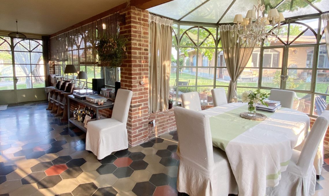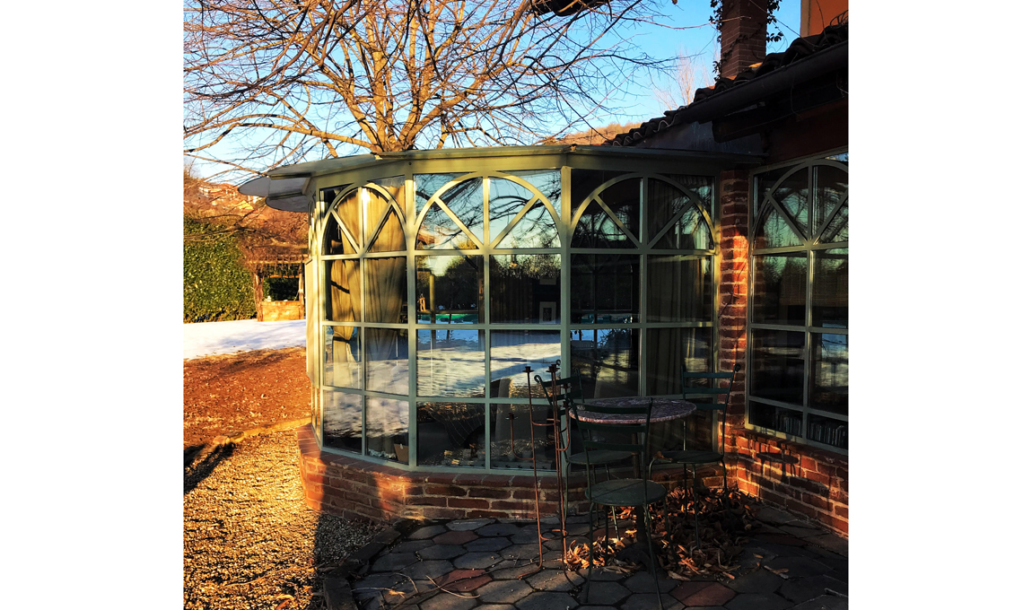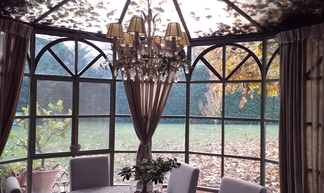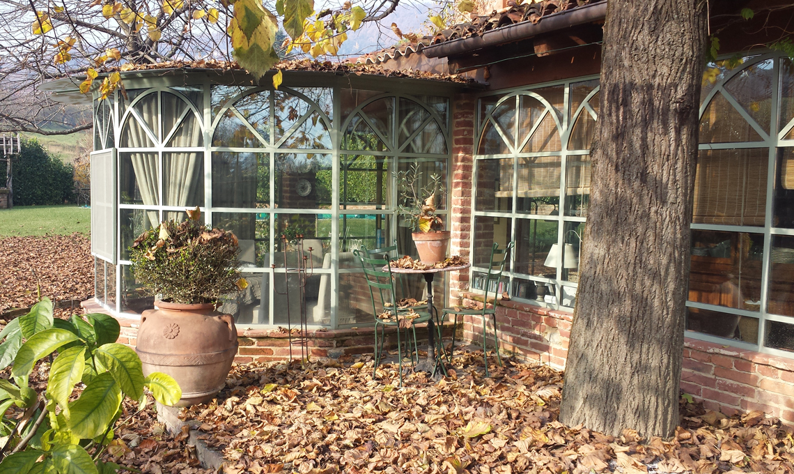 Chiara ci ha raccontato come è nato il progetto per la sua veranda: "Una decina di anni fa abbiamo iniziato l'ampliamento della nostra casa e, essendo amanti dei viaggi e in particolar modo della dolce Provenza, abbiamo tratto ispirazione per una veranda che desse sul nostro giardino. Io e mio marito Roberto l'abbiamo ideata, disegnata e, sebbene Roberto sia un artigiano a tutto tondo per passione, lo scheletro della veranda lo abbiamo fatto realizzare da un fabbro locale. E' un ambiente in cui amiamo stare a cena con gli amici o ad ammirare le nevicate invernali, il verde del giardino d'estate, le foglie autunnali che si depositano a strati leggeri sulla parte vetrata del tetto. La luce e il calore che inondano l'interno ci coccolano nelle giornate invernali e i miei tre figli amano studiare alla sua luce naturale! Spesso il nostro gatto Kitty ci passeggia sulla testa noncurante di noi!"