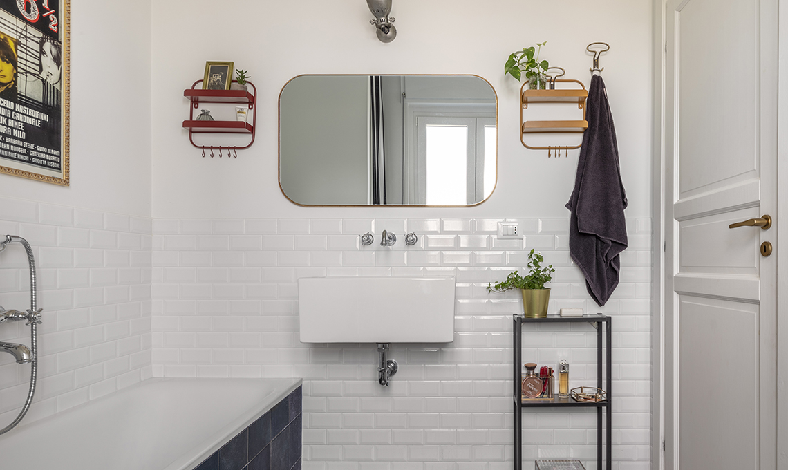 La scelta delle piastrelle diamantate effetto metropolitana per le pareti è in linea con lo stile urbano della casa. rivestimento parete con piastrelle collezione Metro diamantato color talco [CE.SI.]. lavabo [Galassia]. rubinetteria Londra [Cristina Rubinetterie].