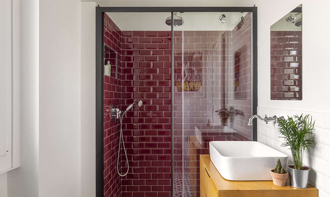 Più piccolo ma più vivace, il secondo bagno ha una doccia walk-in a tutta parete, piastrellata internamente con diamantine color granata. rivestimento parete doccia collezione Metro finitura Granato [CE.SI.]. box doccia [Iperceramica]. piatto doccia ‘Krea’ [Oh my shower]. mobile lavabo [Maisons du Monde]. rubinetti [Cristina Rubinetterie].