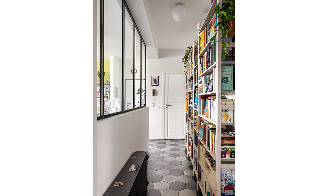 Grazie alla vetrata, il passaggio verso la zona notte è diventato un disimpegno utilizzato per mettere in mostra la libreria, anche questa low-cost, e altri oggetti vintage amati dai proprietari.