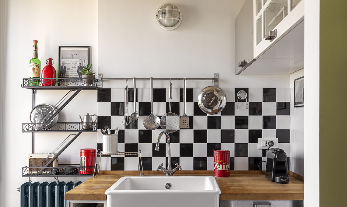 Ogni dettaglio di questa casa è stato pensato e reso unico dai proprietari. In cucina niente è banale: dalle piastrelle con posa a scacchi sopra il lavello alle antine d’acciaio che si alternano a quelle bianche per arrivare allo scaffale in stile ‘scale antincendio’. Il risultato è un mix unico e vivace, reso ancora più originale dal colore della parete verde acido.