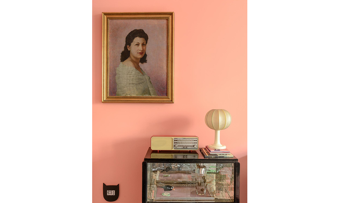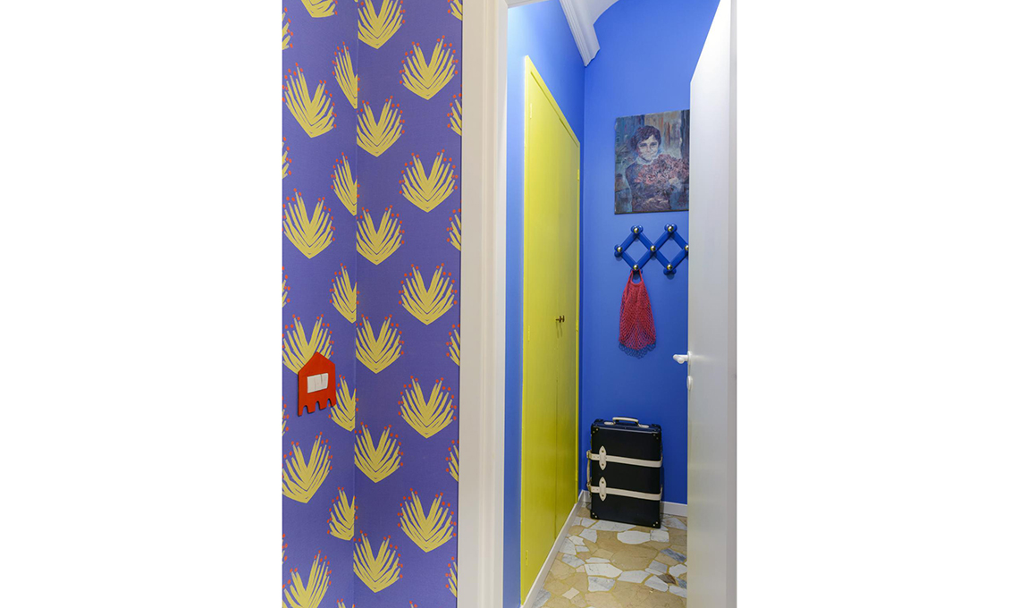 L’astuzia décor per alleggerire il pavimento di marmo nero? Il match con la carta da parati dal retrogusto vintage a micro fiorellini azzurro chiaro e rosso, su fondo scuro. Elegante la tinta corallo usata per dipingere la credenzina e il letto in legno. Il dettaglio inatteso? Le placche per gli interruttori fatti a forma di animali, realizzati da Jennifer Coe. Sono dappertutto nelle stanze, divertiti a cercarle! Carta da parati Laura N.1 [Paola Pagano], quadri [Clara Rota e Illustation].
