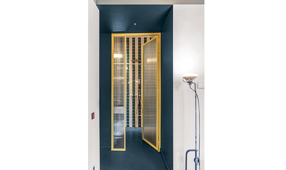 Ilenia amava l’idea di offrire servizi da suite d’hotel agli ospiti. E questa super doccia con pavimento in resina, porta di vetro canneté e piastrelle bicolore è una vera sorpresa che si intravede dal living (pur mantenendo la privacy). E il profilo in metallo giallo della porta dà luce.