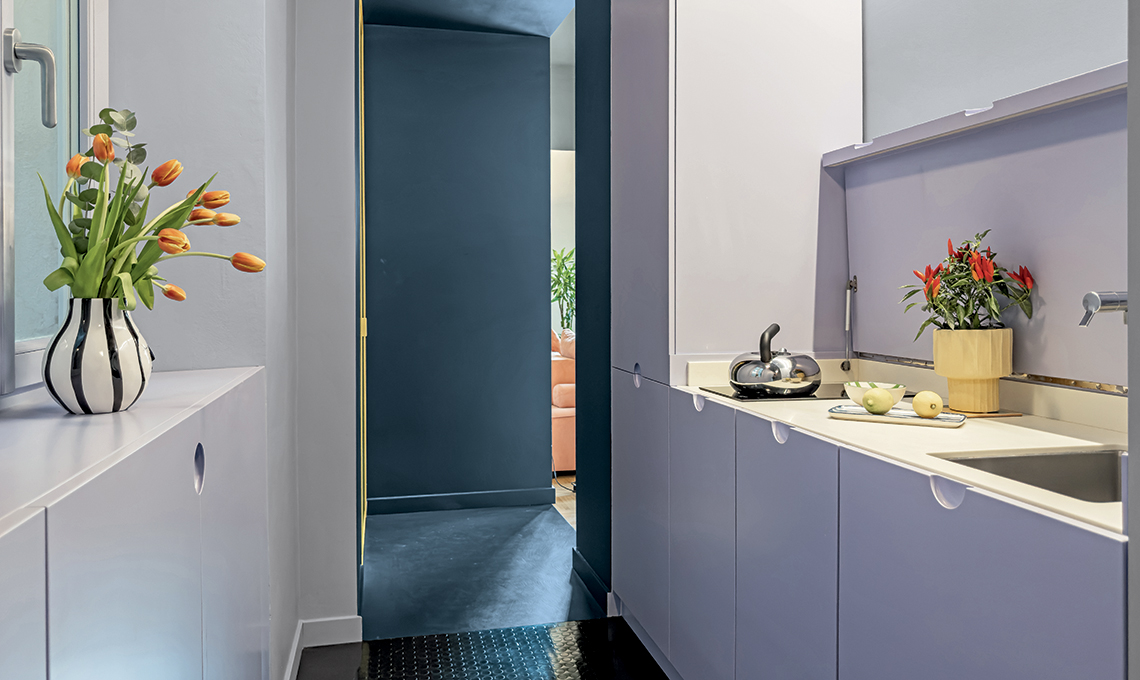Per non sprecare spazio con il classico corridoio, i progettisti hanno creato una nicchia (ricavata dalla camera da letto adiacente) che oggi ospita la cucina lineare. Da qui si accede a tutte le stanze. Sospensioni [De Rerum]. miscelatore abbattibile Su&Giù [Gessi].