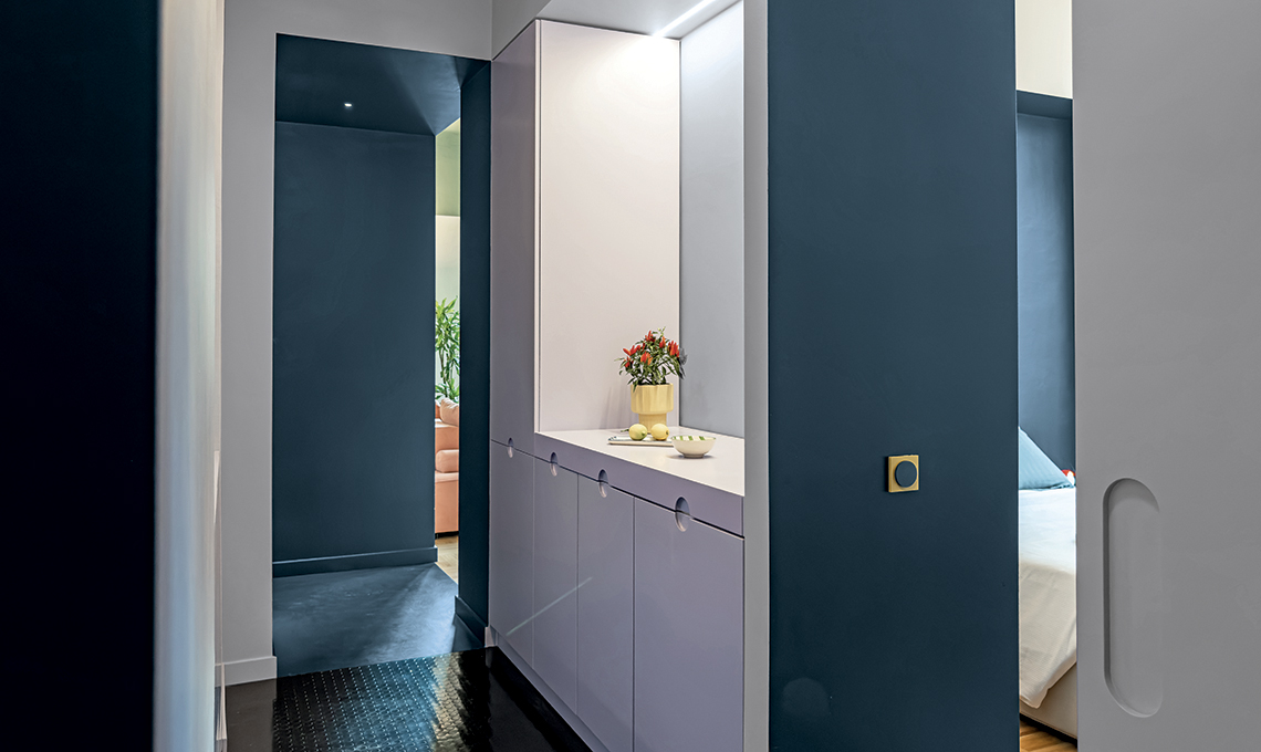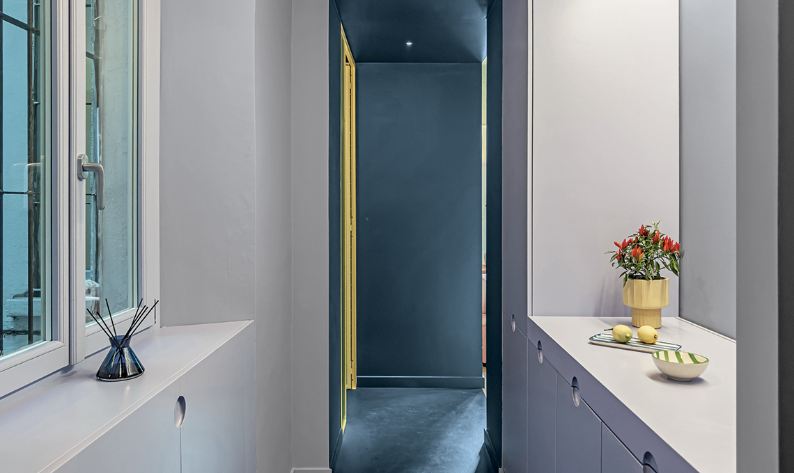 La pianta dell’appartamento era sfidante, con la zona giorno dalla parte opposta rispetto all’ingresso. La casa, che prima era un centro estetico, aveva due corridoi affacciati su un cavedio. I progettisti hanno deciso di non modificare il taglio irregolare, l’unico muro toccato è quello della camera da letto che è arretrato di 60 cm per accogliere una piccola cucina affacciata sul corridoio lungo. Nel corridoio breve hanno posizionato la doccia, staccandola dal bagno dove invece c’è la lavatrice: una scelta insolita ma originale e interessante, specie