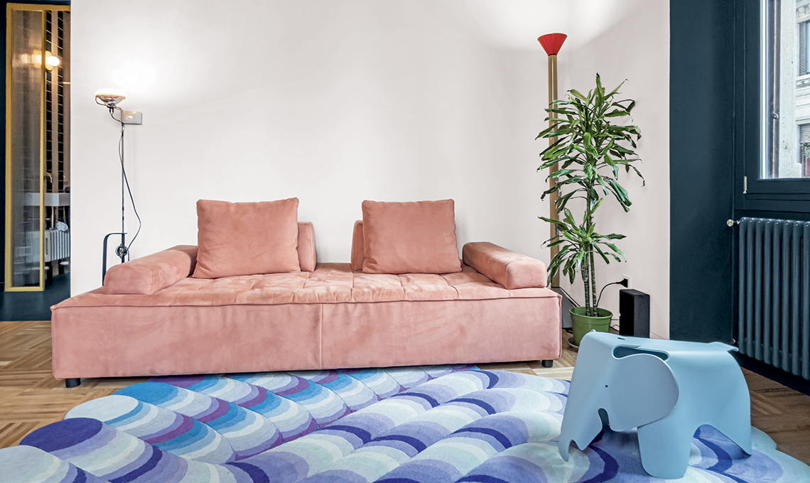 Per l’originalità nella progettazione, il bilocale di Ilenia Fossati ha vinto la menzione di CasaFacile nell’ambito del ‘Premio Achille Castiglioni Design & Ospitalità 2025’ indetto da Ospitami. Divano [BHM Sofà], sgabello Eames Elephant RE [Vitra]. Tappeto Pipeline Freeform 2 disegnato da Patricia Urquiola [CC-Tapis].