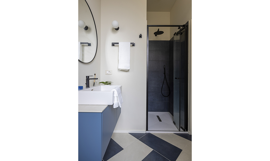 Anche nel secondo bagno [Ikea] torna il pavimento in grés porcellanato geometrico e il blu balena con dettagli grafici neri, ripiano [Cosentino], sanitari [Flaminia], doccia [Arblu].