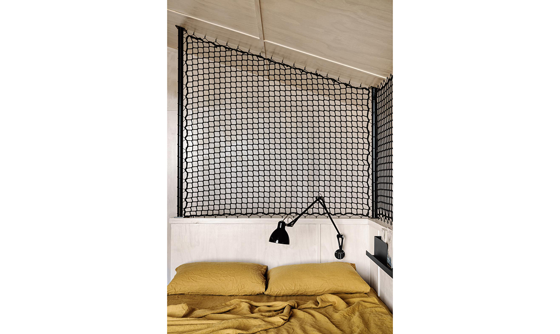 Il terzo arredo, pur più defilato, è il day-bed progettato ‘a incastro’ sotto la scala: guarda il piccolo ‘pianerottolo’ che è allo stesso livello della seduta. La rampa parte dal piano del day-bed, che di giorno aumenta le sedute in ‘salotto’ e di notte è il terzo letto. I cestoni sotto il letto, chiusi da ante, e le mensole sono preziosi contenitori.