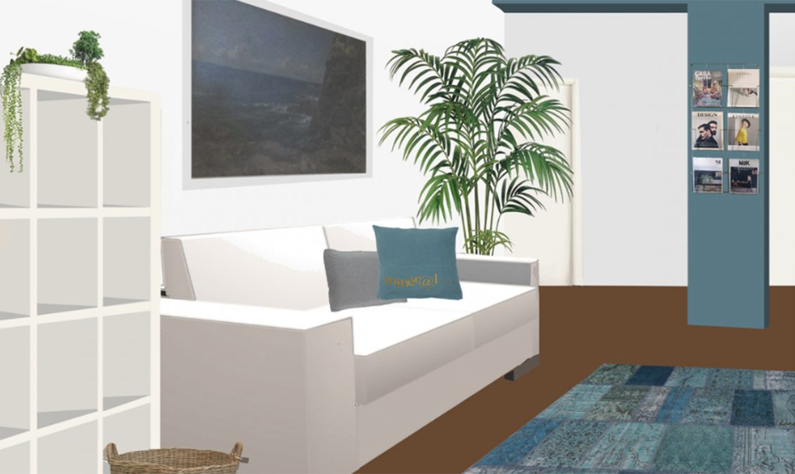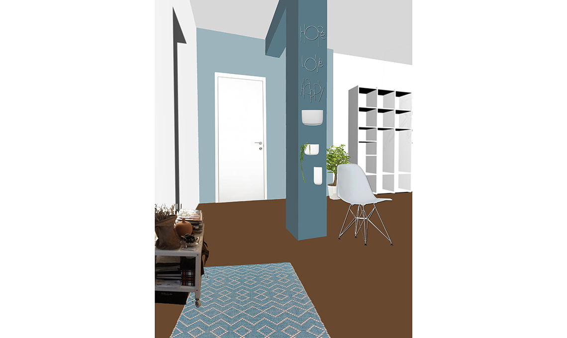 colore, in contrasto con le pareti bianche della casa. Sceglierei un azzurro-blu con punte di grigio che riporterei (alcuni toni più chiaro) anche sulla parete di fronte all’ingresso. Completano il relooking dello spazio alcuni accessori contenitori, i portariviste appesi e le scritte metalliche.»