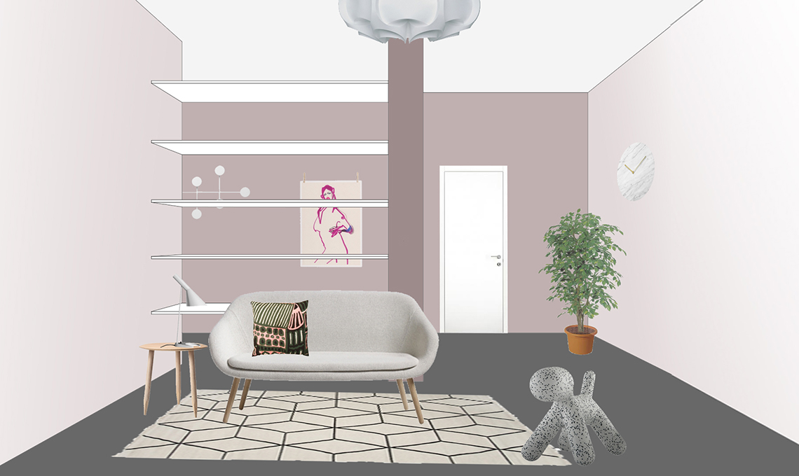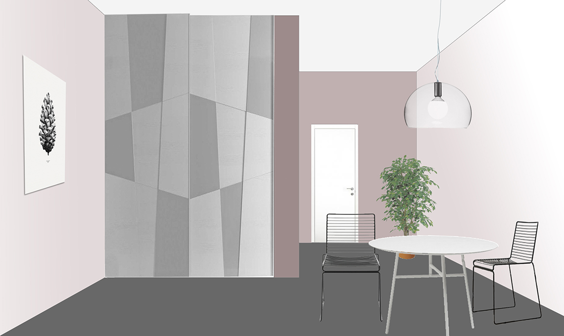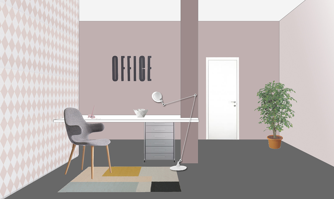 - Nell’ultima proposta ho ideato una zona office per chi lavora da casa. Il pilastro regge una spaziosa scrivania, un semplice piano sospeso attrezzato con una cassettiera lineare con rotelle.
