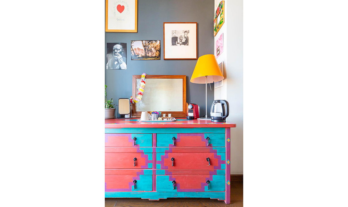 sono accessori da lasciare sempre a disposizione degli ospiti. Sul cassettone dipinto (anche l’interno dei cassetti ha colori vivaci) proveniente dal New Mexico, la lampada da tavolo Costanza [Luceplan]. poltroncina Circle di Yngve Ekström [su Pamono].
