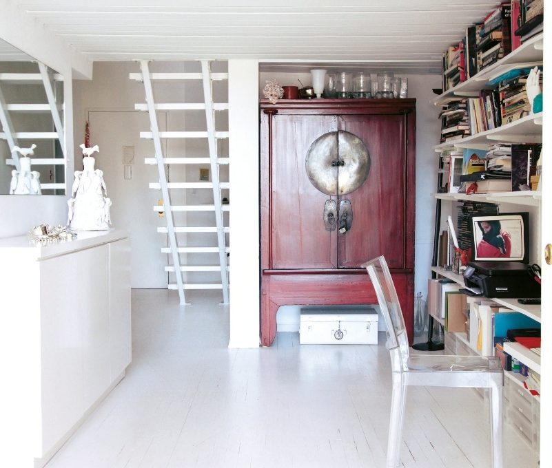 Giuliana, che ha studiato letteratura straniera e ha viaggiato molto in India, nel tempo ha appreso le tradizioni locali e le tecniche di lavorazione dei metalli per rendere i suoi gioielli leggeri ma solidi allo stesso tempo. Anche nelle scelte fatte per gli arredi di casa sua, dove ha privilegiato le forme morbide e sinuose  tipiche del design moderno, risaltano pezzi orientali, dal carattere forte. Un abbinamento che avrebbe potuto creare un po’ di confusione, se non fosse stato ‘gestito’ con un  attento senso dell’ordine  e uno sfondo adatto. Bianco e legno, già lo sappiamo, sono gli elementi ideali per equilibrare un ambiente denso di ricordi. In questo modo, l’ambiente acquista personalità e, al tempo stesso, mostra una forma immacolata e leggera. Quasi una scelta di vita per Giuliana, che adotta lo stesso stile tanto per sé quanto per la propria casa.