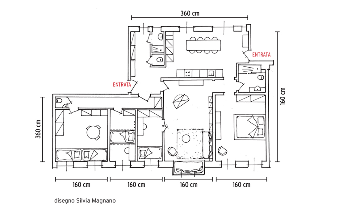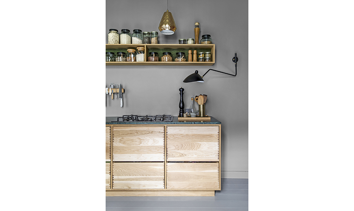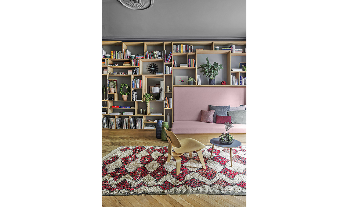 Effetto tetris per la libreria modulare a box, disegnata da Kristian, che ospita la nicchia con il divano.