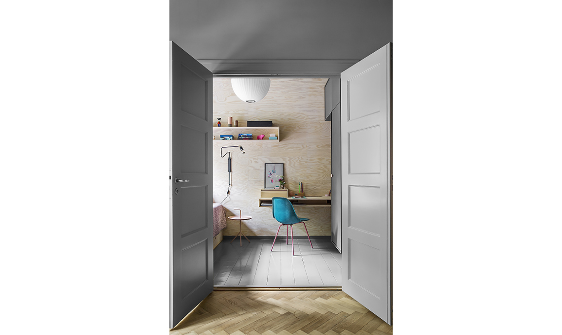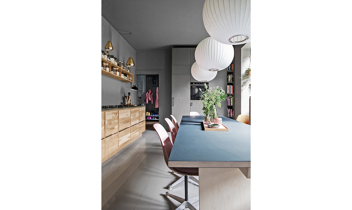 Sedia Plywood DCW, by Charles & Ray Eames, 1950 [Vitra, cm 49,5x55,5x 72,5h € 1.420], lampada a parete oscillante Potence, Jean Prouvé, 1950 [Vitra, cm 203x109h € 1.320]. Sospensione Nelson Saucer Ball, by George Nelson, 1950 [Hay, ø cm 89x35h € 765].