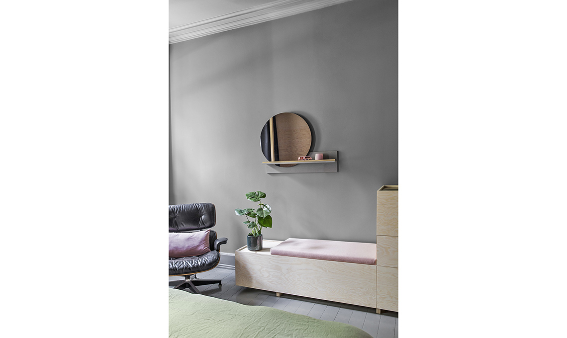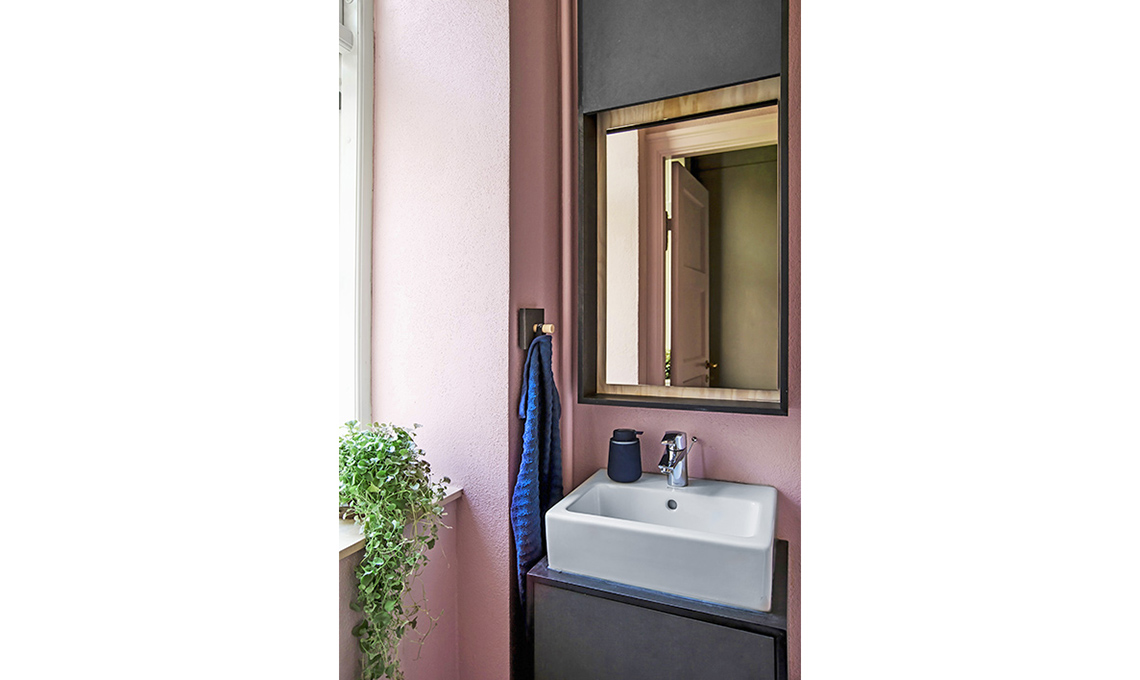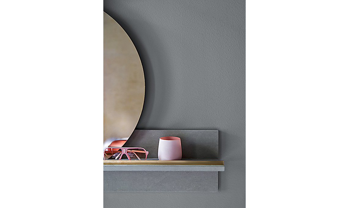 Una piccola mensola nello stesso colore delle pareti diventa un comodo appoggio per lo specchio ed espositore di piccoli oggetti.