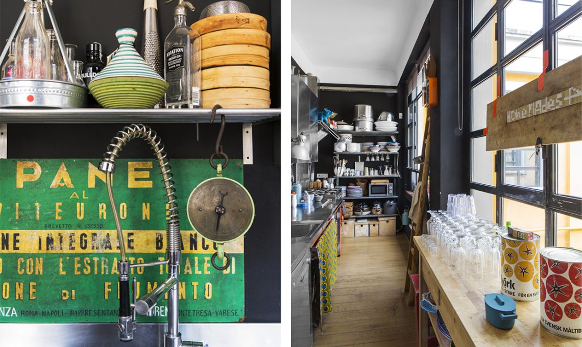 La cucina è uno spazio stretto e lungo che si affaccia sul tavolo da pranzo: solo quando serve viene schermata da una tenda di lino ed è arredata con pezzi high-tech lasciati dal vecchio proprietario. Il nero esalta ogni dettaglio e crea il giusto palcoscenico! Le finestre di ferro offrono luce e scorci strategici sul cortile antico dell’edificio, stile vecchia Milano.