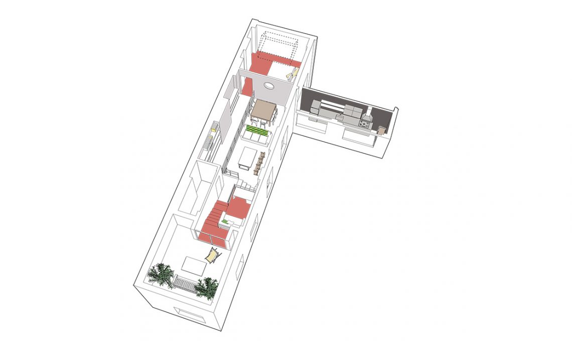 La casa si sviluppa su tre livelli che hanno funzioni e metrature diverse: il piano terra ospita la zona giorno e la camera dei ragazzi; il primo la camera matrimoniale, che gode di privacy e luce naturale; l’ultima rampa, segnata dal Pantone arancione, conduce alla zona studio e alla terrazza.