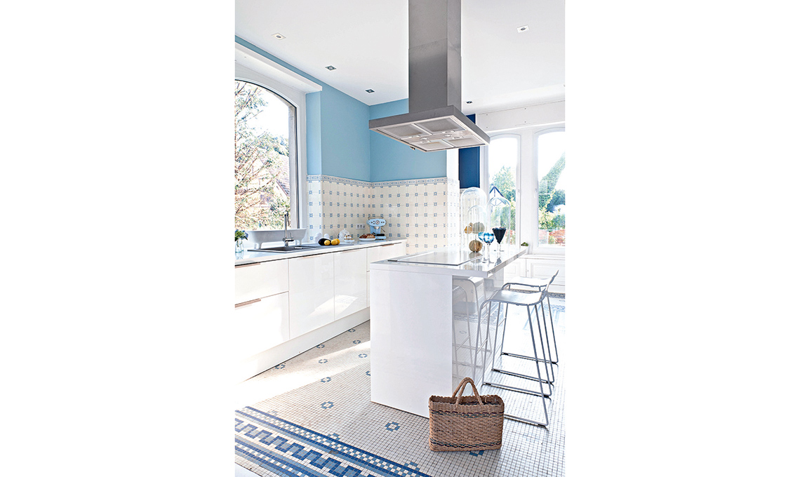 Sandrine ha dipinto le pareti della cucina in tre toni di azzurro in tinta con il mosaico e con le piastrelle originali. Tutto il resto è bianco, a partire dalla cucina [Cuisinella].