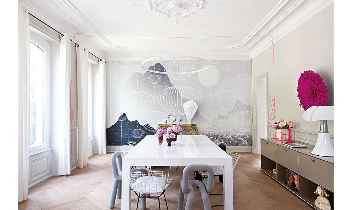 Allunga la prospettiva la wallpaper Île Lointaine disegnata da Sandrine [Artolis by Barrisol]. Lampada Led a soffitto Circle [Le Deun], sedie Diamond disegnate da Harry Bertoia [Knoll] e Bold [Big Game per Moustache]. Sul sideboard tortora [USM], lampada Pipistrello [Martinelli Luce].
