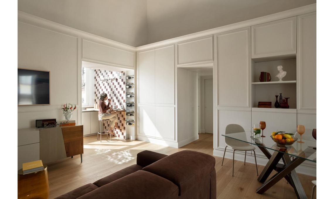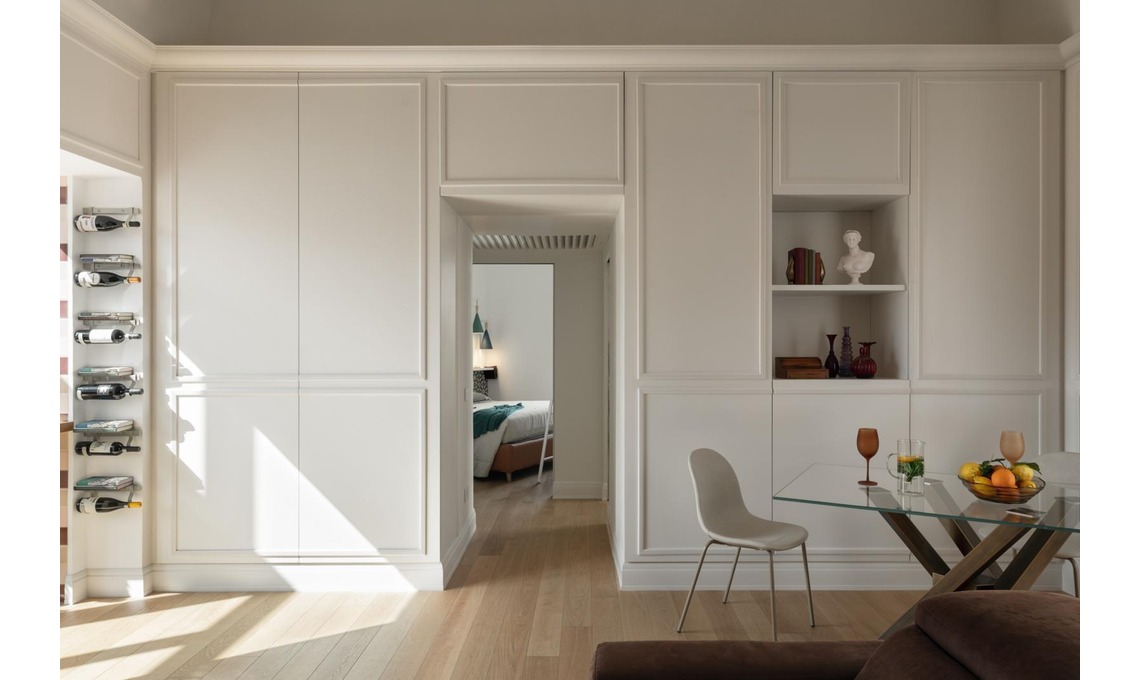 viaggio per lavoro. La boiserie contenitore del living è il vero cuore del progetto. Ha una profondità di circa cm 60 e sfrutta l’altezza di 3 metri della stanza, fino al
