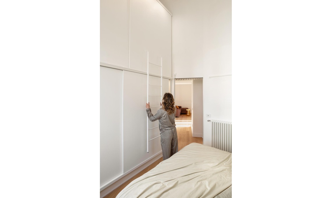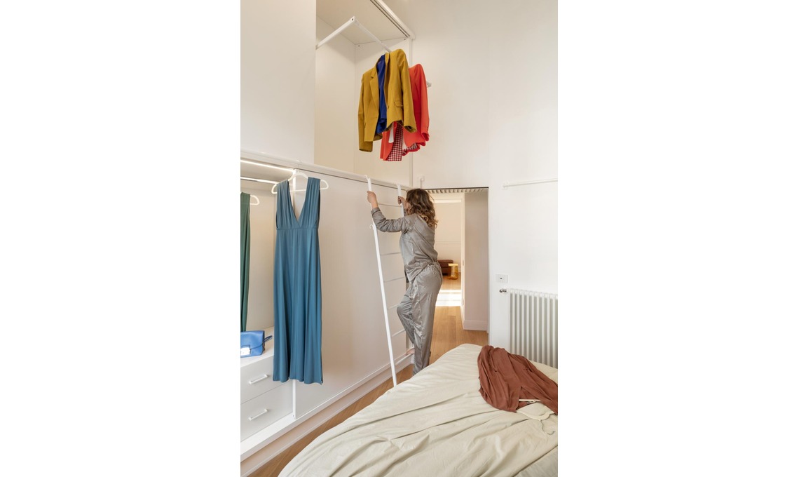 Realizzato su misura, tra un ‘livello’ e l’altro l’armadio ha un tubolare in ferro che fa da alloggio ad hoc per la scala a pioli. Le armadiature a