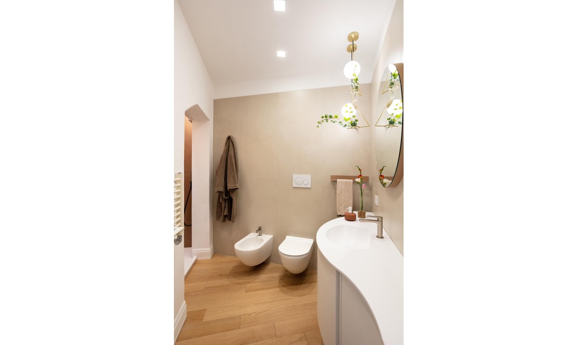 verso il centro dell’ambiente, per ospitare un ampio bacino integrato. Nella nicchia accanto ai sanitari trova spazio la doccia. Una grande