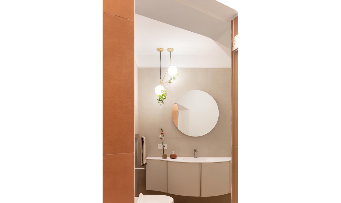 attenzione si è data alle fonti di illuminazione: faretti nelle diverse zone e, sopra il lavabo, sospensioni