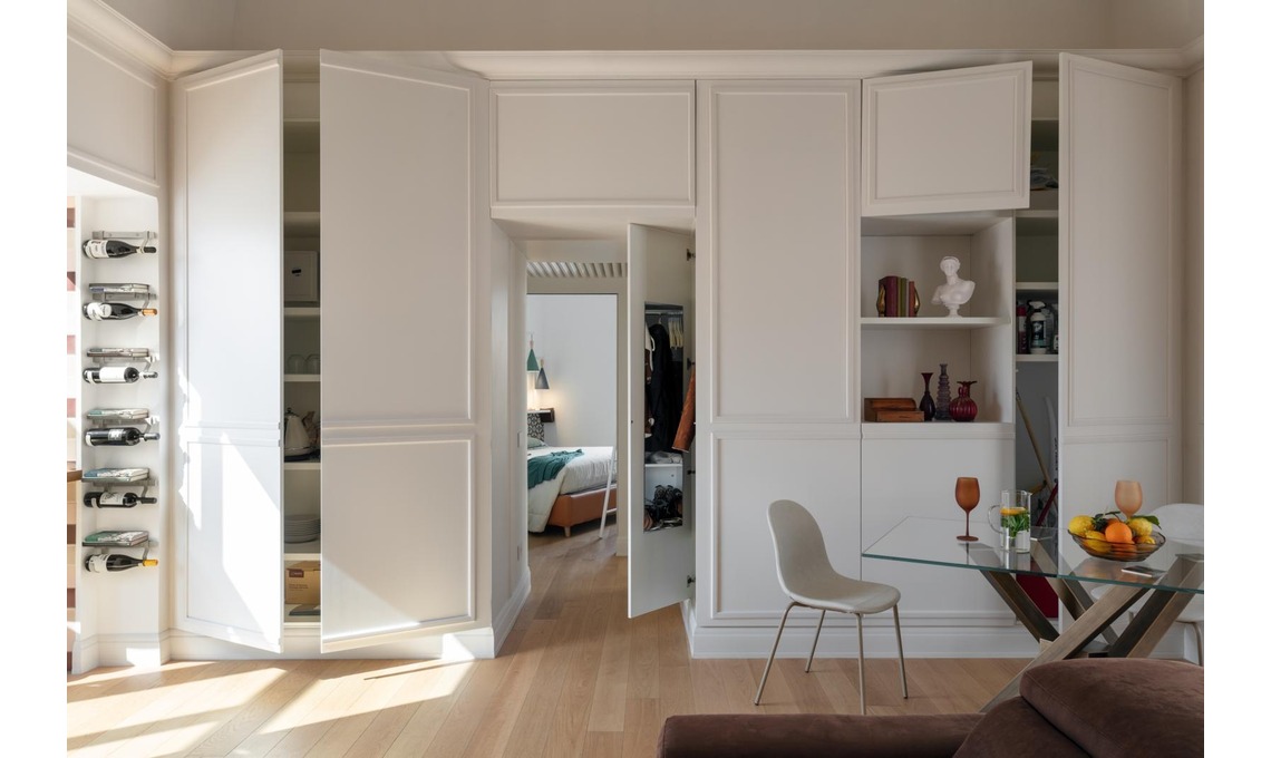 Paola ha affidato la ristrutturazione del bilocale all’architetta Valentina Autiero che nel pieno rispetto delle strutture dell’appartamento – alti soffitti a volta che in soggiorno superano m 4,65 e spessi muri portanti – ha realizzato ciò che Paola voleva e, grazie ad armadiature furbe nel soggiorno e nella camera da letto, ha ottenuto un ulteriore risultato: qui ogni cosa è davvero al suo posto, nascosta dietro le ante di boiserie e guardaroba, bianchi per apparire leggeri nonostante le dimensioni.