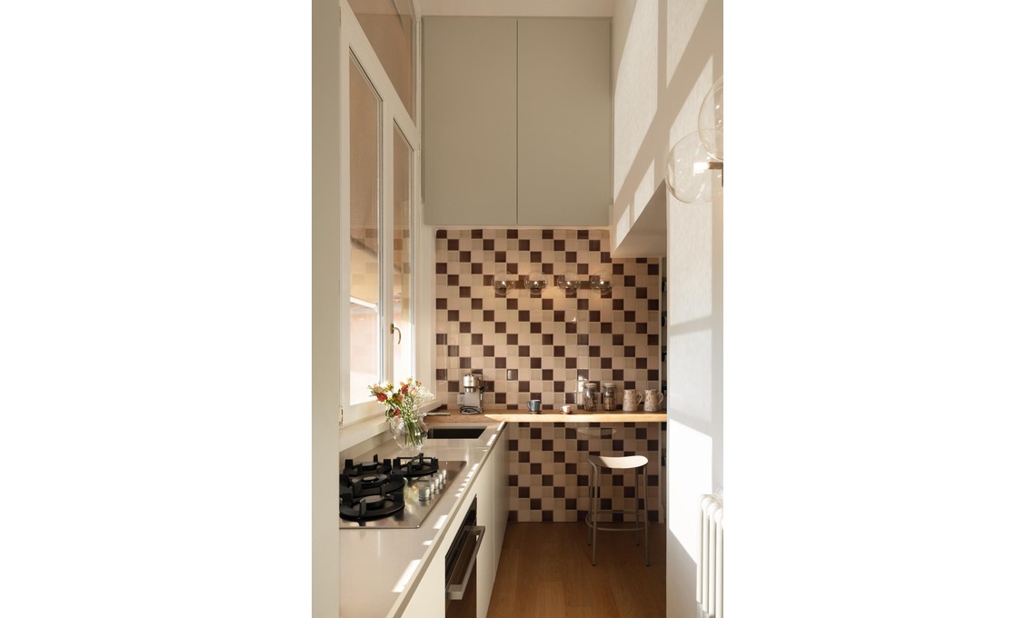 Dall’area living si accede in modo fluido alla zona cucina, a cui fa da invito un banco snack che raccorda i due ambienti. La ‘kitchenette’ prende luce dalla grande