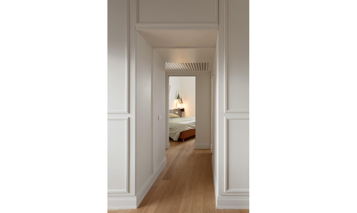 In tutta la casa il pavimento è rivestito in caldo parquet di rovere, alle pareti si sono scelti colori tenui e rilassanti e gli arredi sono ridotti all’essenziale... Un risultato di ordine e pulizia che si gusta fin dal soggiorno, con la grande boiserie protagonista.